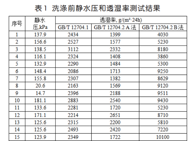 以筆者所在的檢測機(jī)構(gòu)為例,收集了一定時間內(nèi)的沖鋒衣面料檢測樣品,共計(jì) 50 個,其中 35 個樣品采用上述方法,進(jìn)行靜水壓和透濕率測試,研究不同方法之間的關(guān)系,結(jié)果見表 1。15 個樣品按照GB/T 32614-2016《戶外運(yùn)動服裝 沖鋒衣》測試比較樣品洗滌前、后的靜水壓和透濕率變化,結(jié)果見表 2。