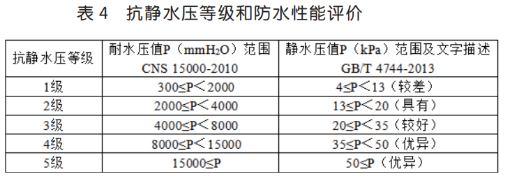 可見,防水透濕面料倒杯 - 蒸發(fā)法的透濕率基本符合正態(tài)分布,≤ 4000g/(m2·24h)的比例為10.0%,> 10000g/(m2·24h)的比例 10.0%,一半以上測試結(jié)果集中在 5000~ 9000 g/(m2·24h)。而靜水壓測試結(jié)果相對比較分散,≤ 30kPa 的比例為 16.0%,> 170kPa 的比例為 12.0%,70% 以上的測試結(jié)果大于 70kPa。以 GB/T 32614-2016《戶外運(yùn)動服裝 沖鋒衣》中對沖鋒衣面料 I 級功能性要求而言,即洗滌前透濕率≥ 5000g/(m2·24h),靜 水 壓 ≥ 50kPa,50 塊 面 料 透 濕 率 合 格 率 為84.0%,靜水壓合格率為 82.0%,合格率基本一致。但靜水壓指標(biāo)相對更好,三分之二的樣品靜水壓> 100kPa,遠(yuǎn)遠(yuǎn)滿足標(biāo)準(zhǔn)要求,這也驗(yàn)證了靜水壓指標(biāo)通過在織物表面的涂層處理很容易符合標(biāo)準(zhǔn)要求。將 GB/T 4744-2013《紡織品 防水性能的檢測和評價 靜水壓法》及臺灣標(biāo)準(zhǔn) CNS 15000-2010《防水透濕紡織品性能評估》[8] 對靜水壓的評價性能列如表 4 所示。