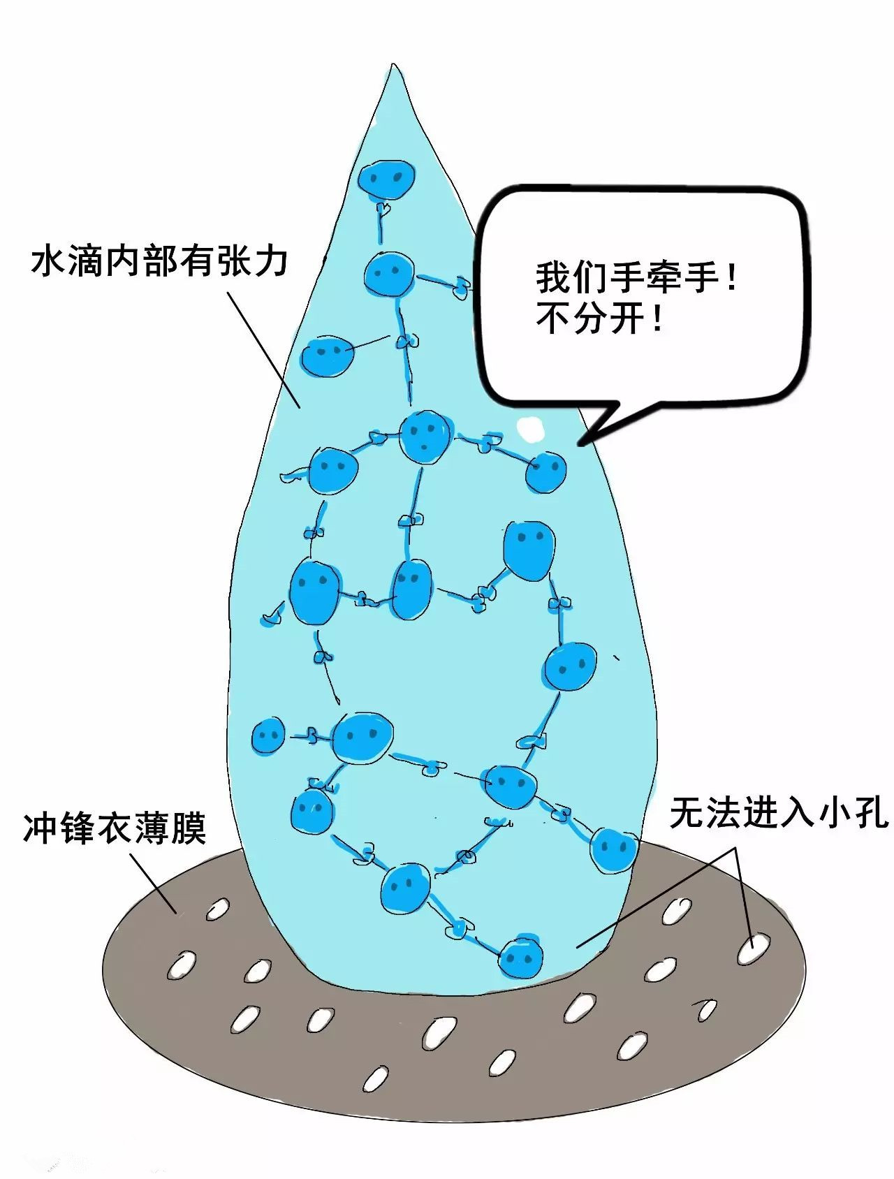 1)水滴內(nèi)部的張力讓它無(wú)法進(jìn)入薄膜。因?yàn)橛甑蔚摹皬埩Α焙軓?qiáng),水分子之間強(qiáng)烈吸引,就像抱團(tuán)在一起。當(dāng)雨滴接觸薄膜時(shí),沒有水分子愿意離開水滴。