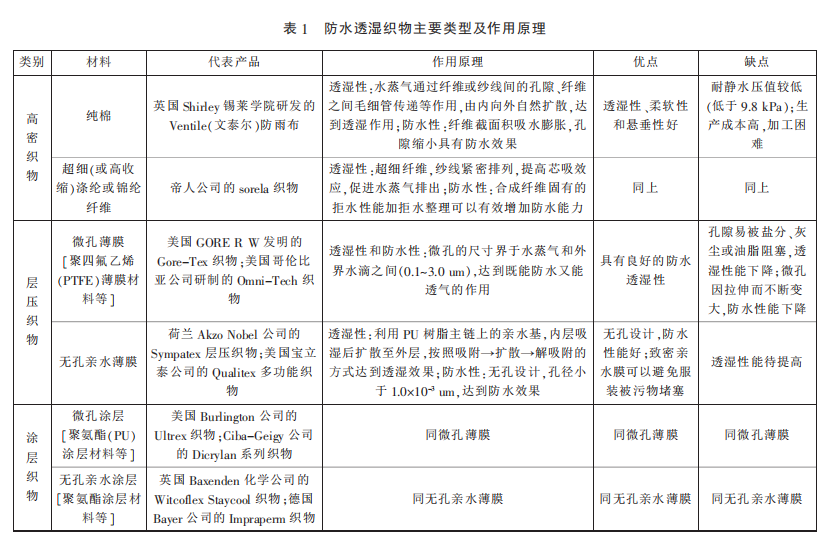 優(yōu)質(zhì)防水透濕面料可以在一定水壓下不被雨水潤(rùn)濕或滲透,同時(shí)將人體散發(fā)的汗液蒸汽擴(kuò)散或傳導(dǎo)到外界,降低人體微氣候區(qū)的濕度,增強(qiáng)穿著的舒適度和安全性。自1940年,研制出第一個(gè)防水透濕織物,目前,防水透濕面料已獲長(zhǎng)足發(fā)展。根據(jù)加工工藝,防水透濕面料可分為高密織物、層壓織物和涂層織物,見(jiàn)表1。