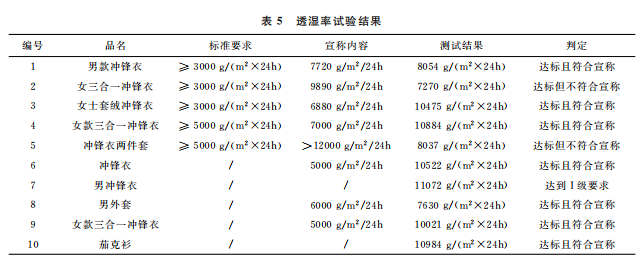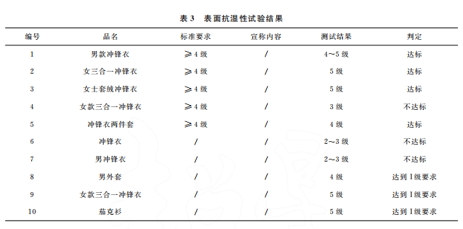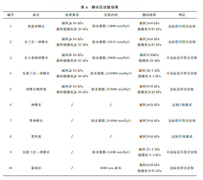本文最終的判定是結(jié)合 GB/T32614—2016《戶外運(yùn)動(dòng)服裝 沖鋒衣》中面料功能性要求和產(chǎn)品銷售時(shí)的吊牌宣稱進(jìn)行。達(dá)標(biāo)是指符合沖鋒衣的合格品 標(biāo) 準(zhǔn) 要 求,反 之 則 不 符 合。10 件 樣 品中,只有5件達(dá)標(biāo),且只有3件是符合吊牌宣稱內(nèi)容。其中,標(biāo)示了 GB/T32614—2016的沖鋒衣,有3件達(dá)標(biāo),合格率為60%。近年來(lái),監(jiān)管部門的抽查合格率一般在80%左右。這次比較試驗(yàn)合格率偏低的原因可能是樣品量較少,樣品的價(jià)格區(qū)間比較集中,且考核了接縫處的靜水壓。值得注意的是有2件沒(méi)有標(biāo)示 GB/T32614—2016的外套,其性能都符合標(biāo)準(zhǔn)要求。此外,銷售方對(duì)靜水壓的宣稱都偏高,有3件達(dá)標(biāo)了卻不符合自身的宣稱內(nèi)容。沖鋒衣 GB/T32614—2016標(biāo)準(zhǔn) 中 I級(jí) 對(duì) 靜 水 壓 的 要 求 也 只是:面料≥50kPa和面料接縫處≥50kPa,銷售 方卻往往宣稱100kPa,甚至達(dá)150kPa,而且也沒(méi)有充分考慮到面料接縫處?kù)o水壓值會(huì)相對(duì)偏小的現(xiàn)實(shí)。需要警 醒 的 是,5 件 標(biāo) 示 了 GB/T32614—2016的沖鋒衣其綜合宣傳都不符合規(guī)定,存在執(zhí)行標(biāo)準(zhǔn)標(biāo)注正確卻夸大宣傳的嫌疑。