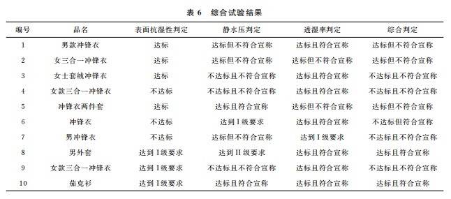表面抗?jié)裥浴㈧o水壓和透濕率綜合統(tǒng)計(jì)的測(cè)試結(jié)果見(jiàn)表6。