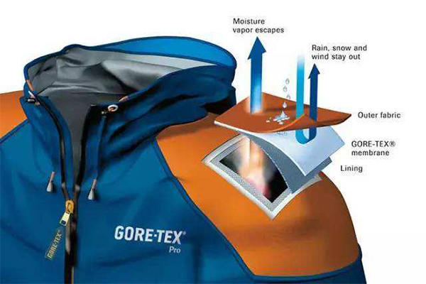 (1)一種是EPTFE復(fù)膜的微孔型面料,目前國內(nèi)多是GORE-TEX、DENTIK、EVENT、3TO1-TEX這幾種。它防水透氣的功能是在服裝的外面料上復(fù)合一層微孔薄膜,其中的微孔比水滴分子小,又比氣體分子大,可以在阻擋雨水的同時揮發(fā)自身的汗氣。
