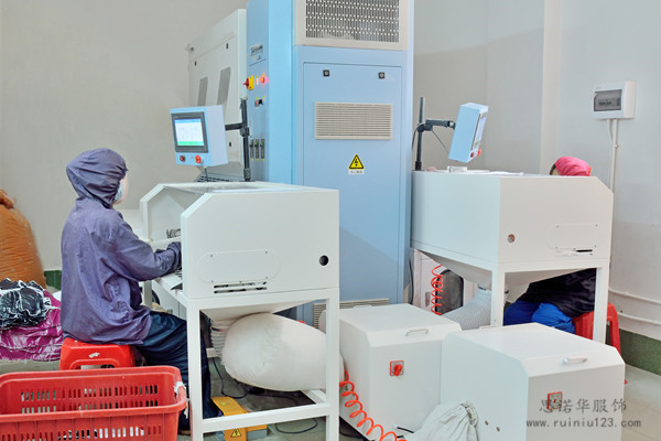 [導讀]:一個充絨口含4把電子秤,每格精確度高;4個充絨口同時工作,速度快,每天產量是傳統手工充絨的5倍。充絨口帶有自動回收羽絨系統,大大減少羽絨的損耗。