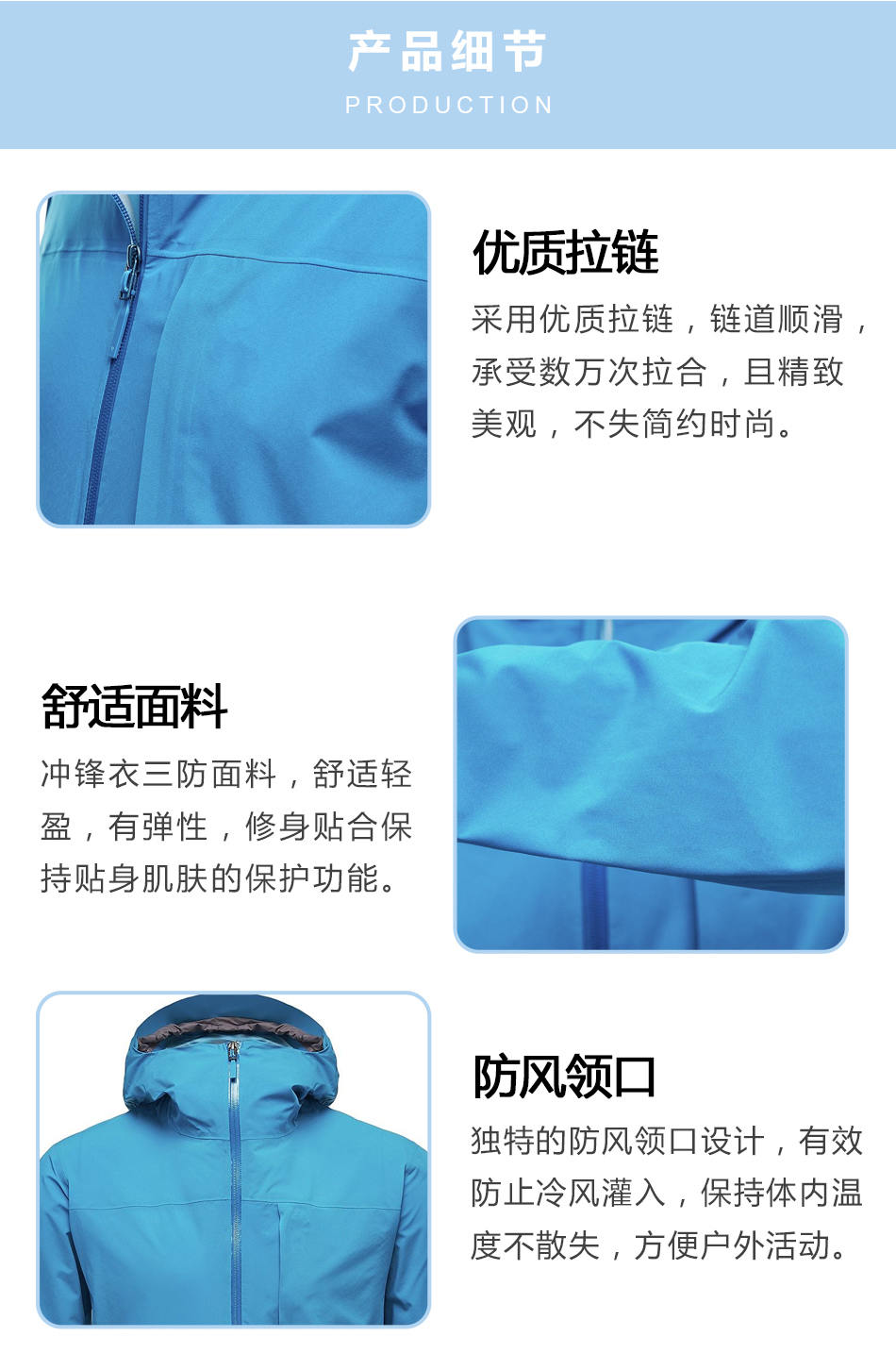 • 舒適面料沖鋒衣加工使用三防面料,舒適輕盈,有彈性,修身貼合保持貼身肌膚的保護功能。