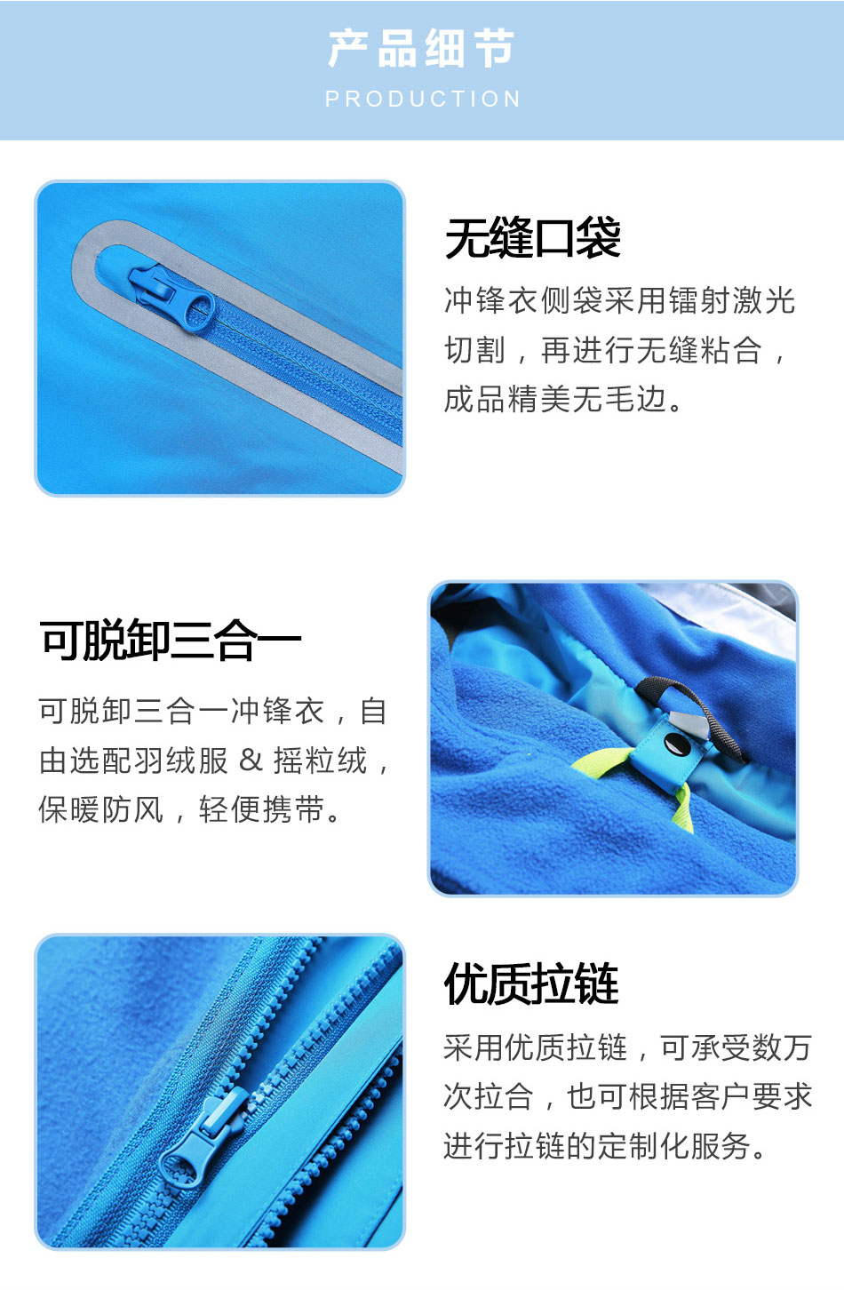 • 可脫卸三合一沖鋒衣:可脫卸沖鋒衣定制,自由選配羽絨服&搖粒絨,保暖防風,輕便攜帶。