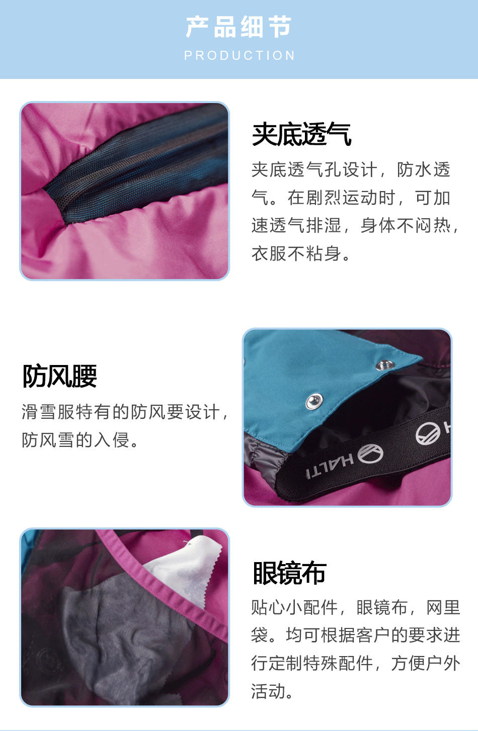 【網袋&眼鏡布】貼心小配件,網里眼鏡布,均可根據客戶要求定制滑雪服貼牌生產的小配件。