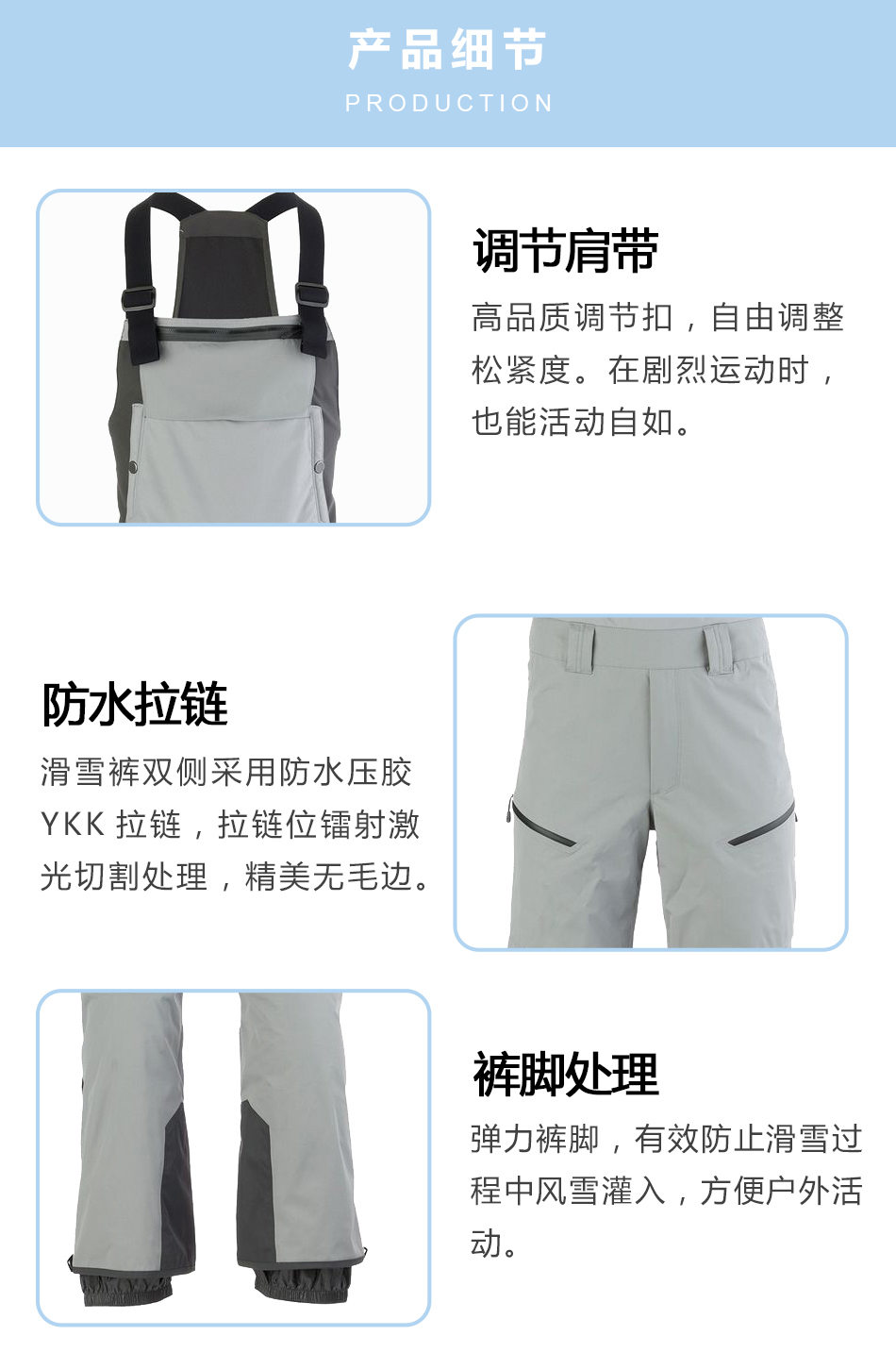 防水拉鏈:滑雪褲生產(chǎn)的側采用防水壓膠YKK拉鏈,拉鏈位鐳射激光切割處理,精美無毛邊。