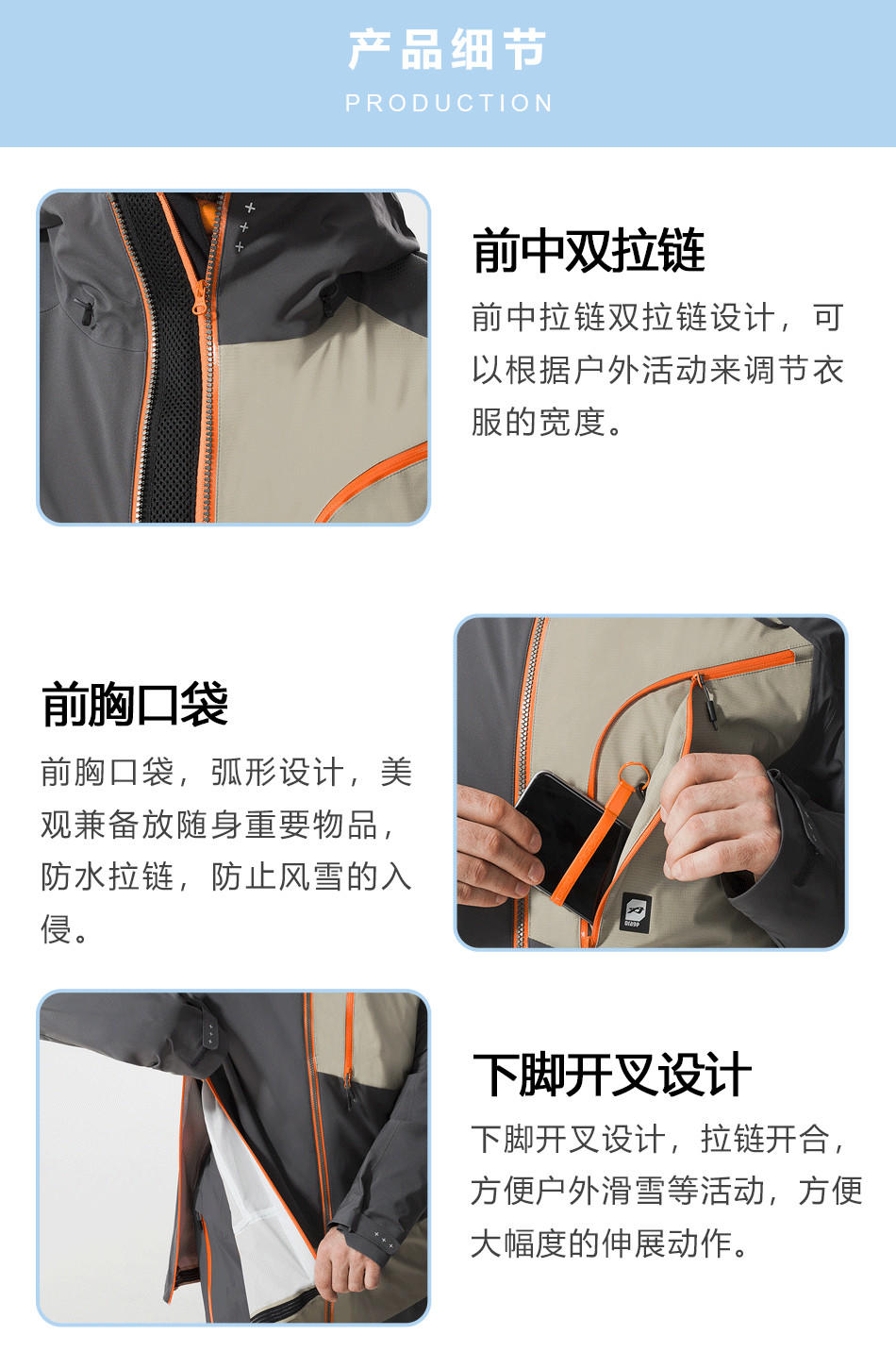 【前中雙拉鏈】前中雙拉鏈設計,可以根據戶外活動調節(jié)衣服的寬度