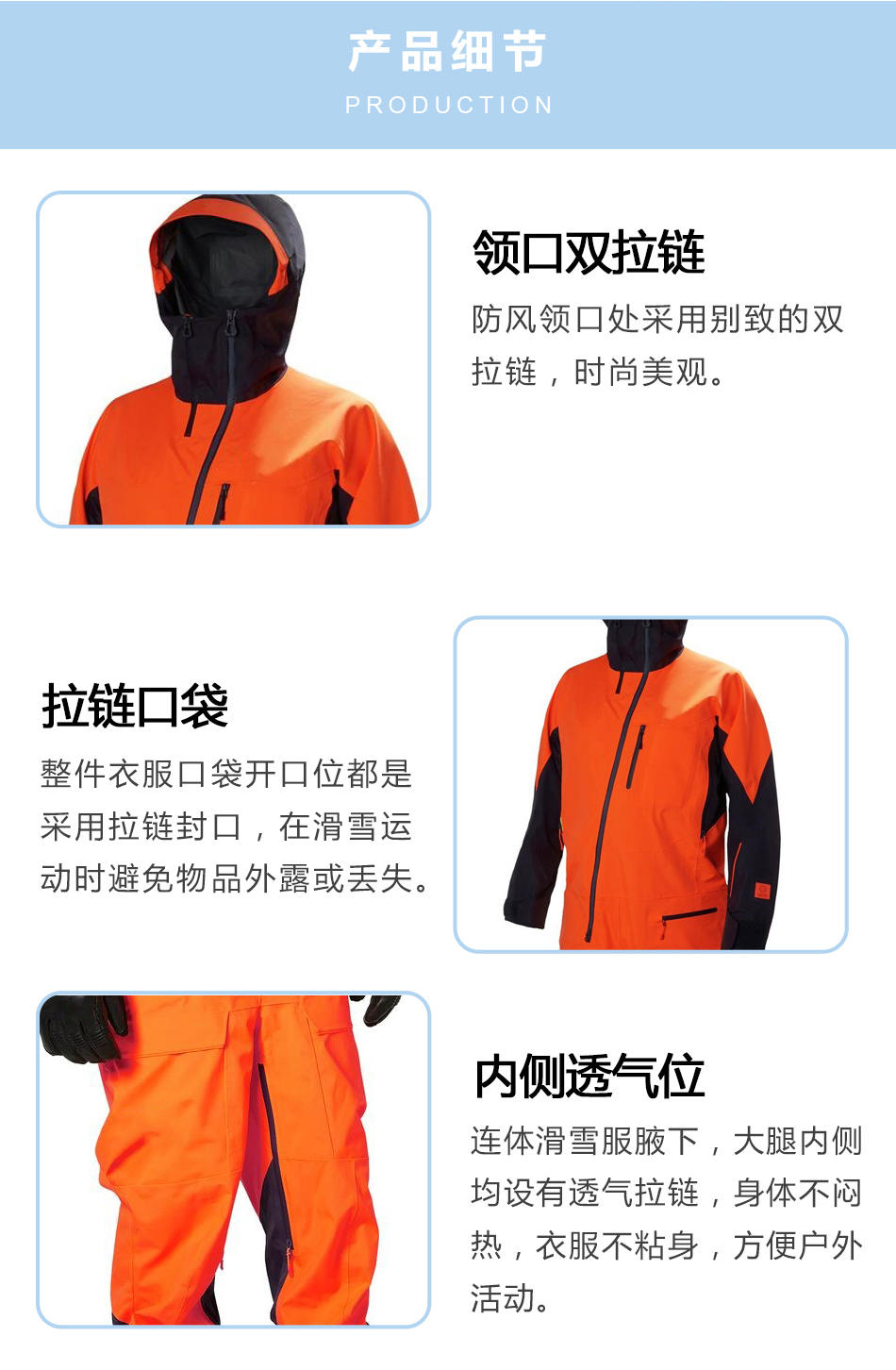 • 內側透氣位:連體滑雪服腋下,大腿內側均設有透氣拉鏈,身體不悶熱,衣服不粘身,方便戶外活動。